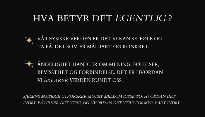 Har du drøftet rundt tematikker som: hva er meningen med livet? Er det en mening med alt som skjer? Finnes det noe mer mellom himmel og jord enn hva øyet kan se? … da kan dette være riktig sted for deg. Sjelens Materie er for oss som aldri kunne slå oss til ro med hva det blotte øye kan se, som den totale sannheten. Vi som fortsetter å søke noe mer. Som bærer på en konstant nysgjerrighet på om livet og vår eksistens på jorden er større enn mennesket selv.